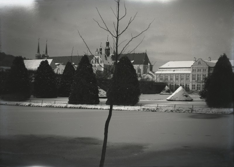 Zimowy, wieczorny widok parku oliwskiego i zamarznięty "łabędzi staw" przedstawia poniższe ujecie wykonane w dniu 16 grudnia 1940 roku.