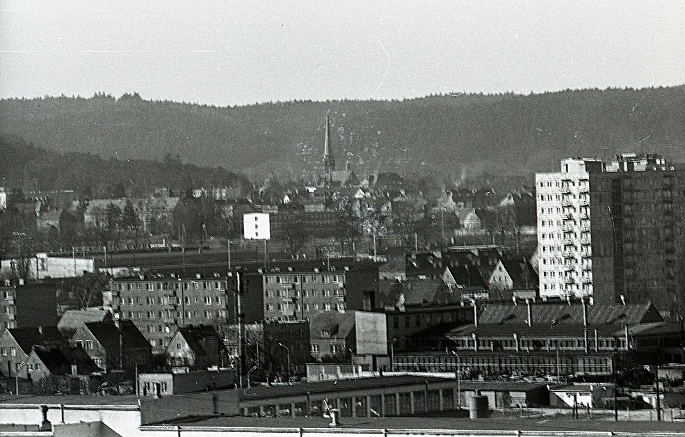 Fotografia wykonana z bloku przy ulicy Startowa 23. Na pierwszym planie po prawej stoi wieżowiec na ul. Kołobrzeskiej 11. Po lewej czteropiętrowe budynki przy Malborskiej. W głębi hale Bimetu. Dalej widać szkołę przy ul. Kaszubskiej oraz wieże i dach kościoła przy Leśnej. Fot. z 1975 roku.