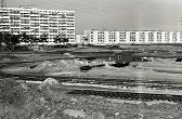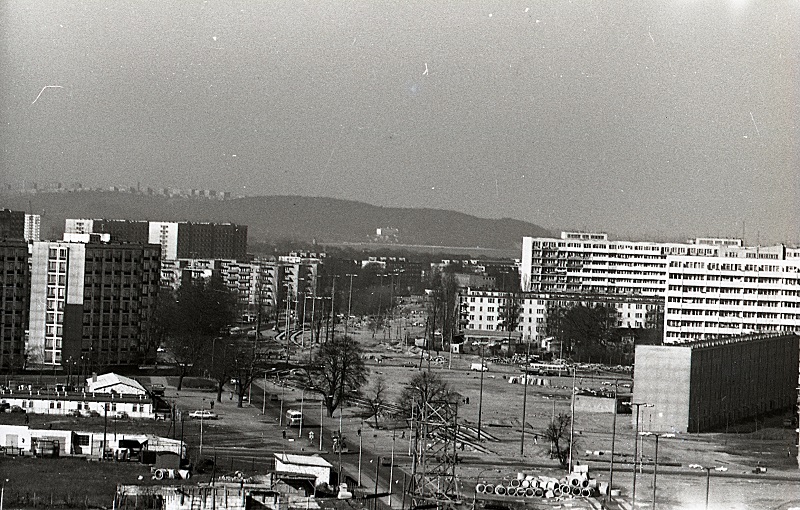 Na pierwszym planie ul. Chłopska i budowa linii tramwajowej. Po prawej stronie m.in. falowiec przy Obrońców Wybrzeża i następny przy Jagiellońskiej. Po lewej w głębi czteropiętrowe budynki przy ul. Piastowskiej oraz dalej bloki przy Pomorskiej. Fot. z 1975 roku.