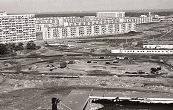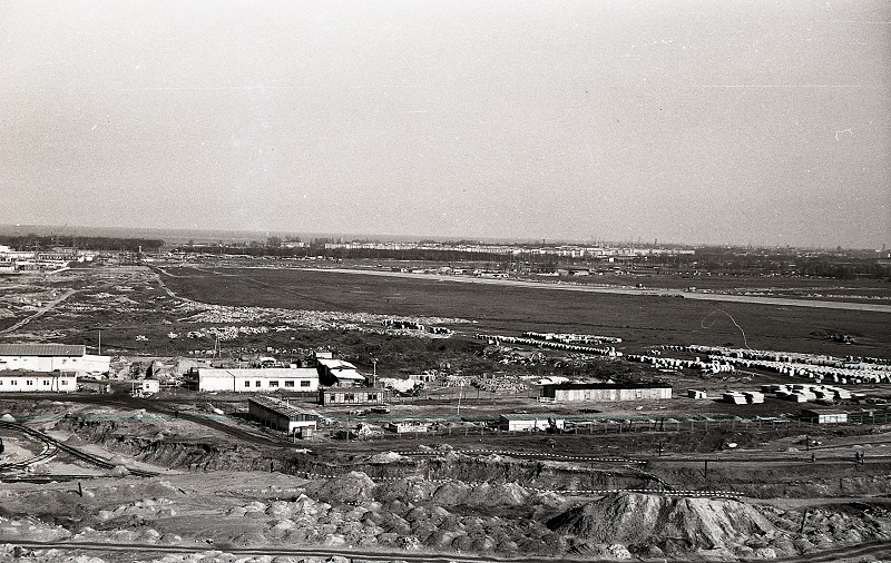 Widok z wieżowca stojącego przy ul. Starowej 23 w kierunku obecnego osiedla Gdańsk Zaspa. W głębi pas startowy nieczynnego od 1974 roku lotniska. Dalej zabudowana Brzeźna i Zatoka Gdańska. Fotografię wykonano w 1975 roku.