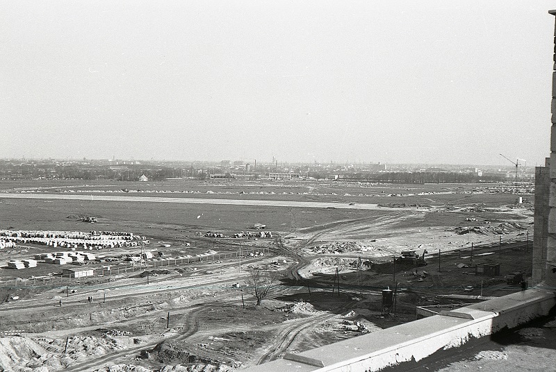 Widok z wieżowca stojącego przy ul. Starowej 23 w kierunku obecnego osiedla Gdańsk Zaspa. W głębi pas startowy nieczynnego od 1974 roku lotniska. Na horyzoncie po lewej m.in. dźwigi stoczniowe. Fotografię wykonano w 1975 roku.