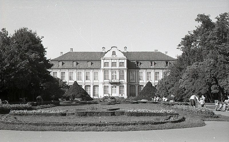 Fragment parku oliwskiego im. Adama Mickiewicza (od 1955) oraz południowa fasada spalonego w 1945 roku Pałacu Opatów. Po odbudowie trwającej 7 lat i zakończonej w 1965 roku znalazło tu swoją siedzibę Muzeum Etnograficzne wówczas oddział Muzeum Pomorskiego. Fot. z 1975 roku.