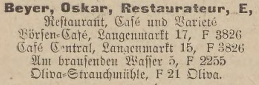Wcześniej Oskar Beyer prowadził rozlewnię piwa i kawiarnię przy ul. Am Brausenden Wasser (Wartka) pod nr 5. W styczniu 1919 roku uruchomiono tam znaną restaurację Bronisława Kubickiego.