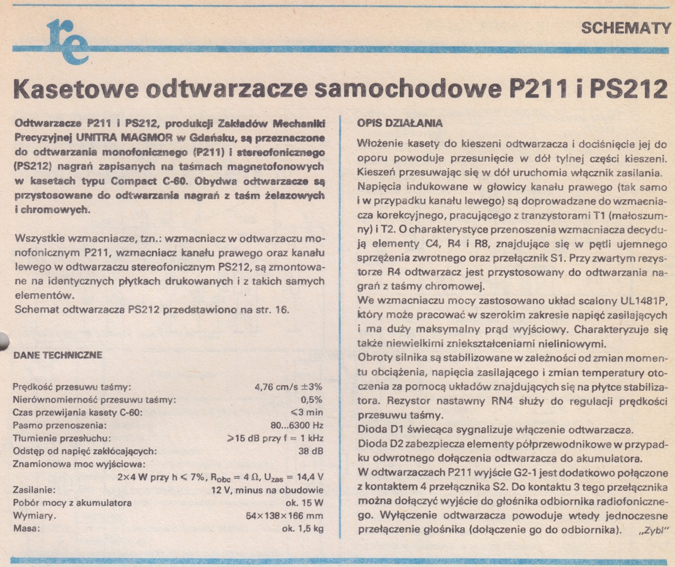 Miesięcznik Radio Elektronik nr r. (): ”Odtwarzacze P211 i PS212, produkcji Zakładów Mechaniki Precyzyjnej UNITRA MAGMOR w Gdańsku są przeznaczone do odtwarzania monofonicznego (P211) i stereofonicznego (PS212) nagrań zapisanych na taśmach magnetofonowych w kasetach typu Compact C-60. Obydwa odtwarzacze są przystosowane do odtwarzania nagrań z taśm żelazowych i chromowych.”