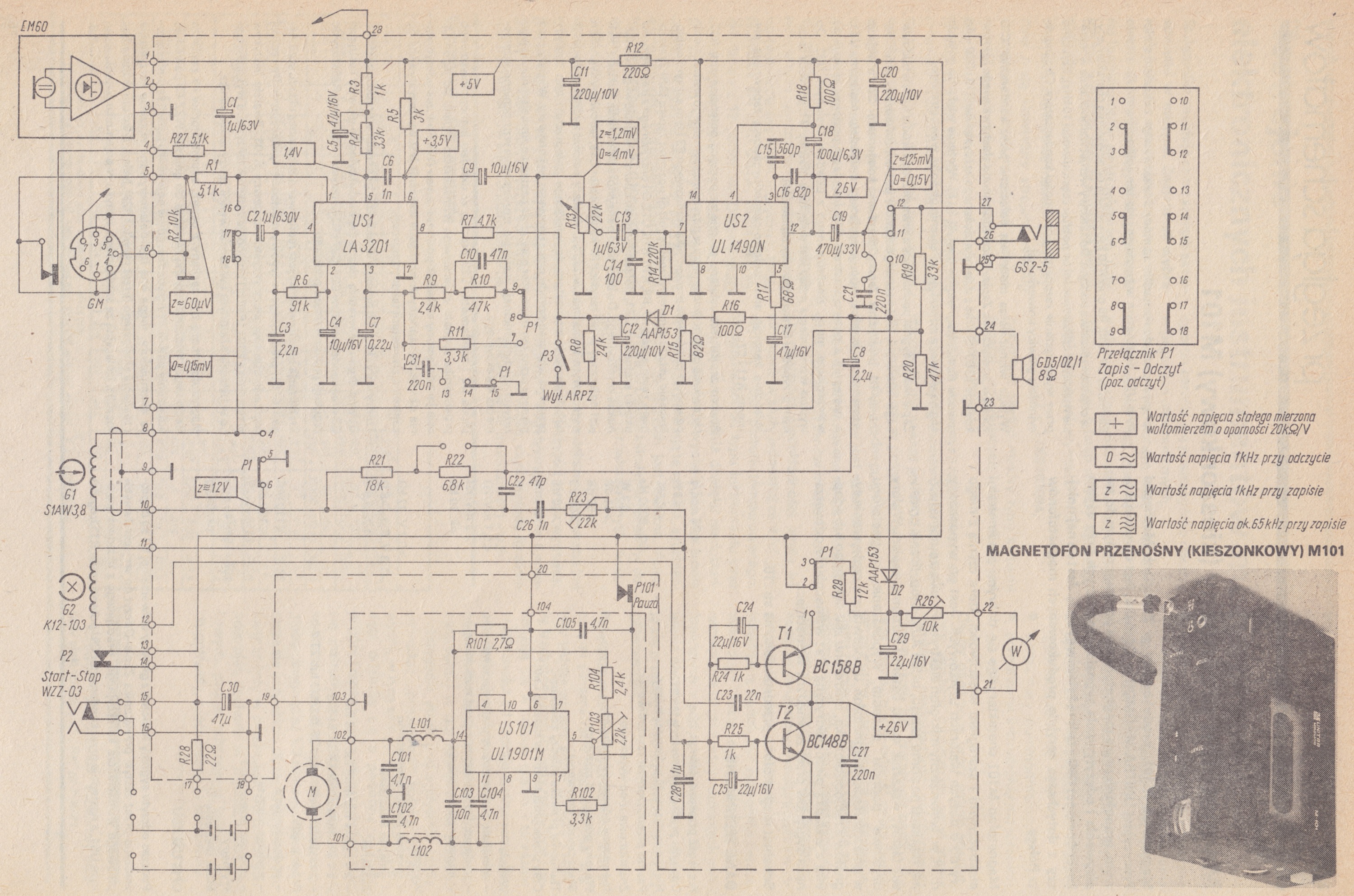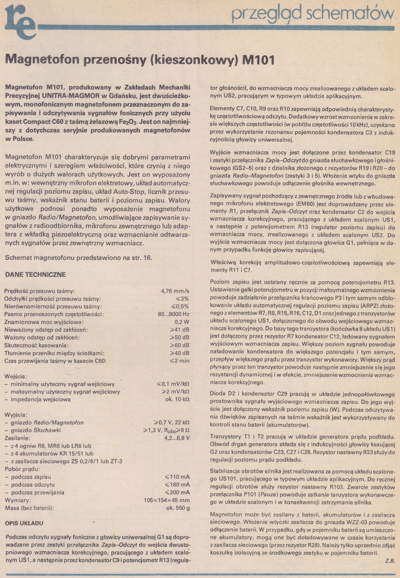 Miesięcznik Radio Elektronik nr r. (): ”Magnetofon M101, produkowany w Zakładach Mechaniki Precyzyjnej UNITRA-MAGMOR w Gdańsku, jest dwuścieżkowym, monofonicznym magnetofonem przeznaczonym do zapisywania i odtwarzania sygnałów fonicznych przy użyciu kaset Compact 60 z taśmą żelazową Fe2O3. Jest on najmniejszy z dotychczas produkowanych seryjnie magnetofonów w Polsce.”