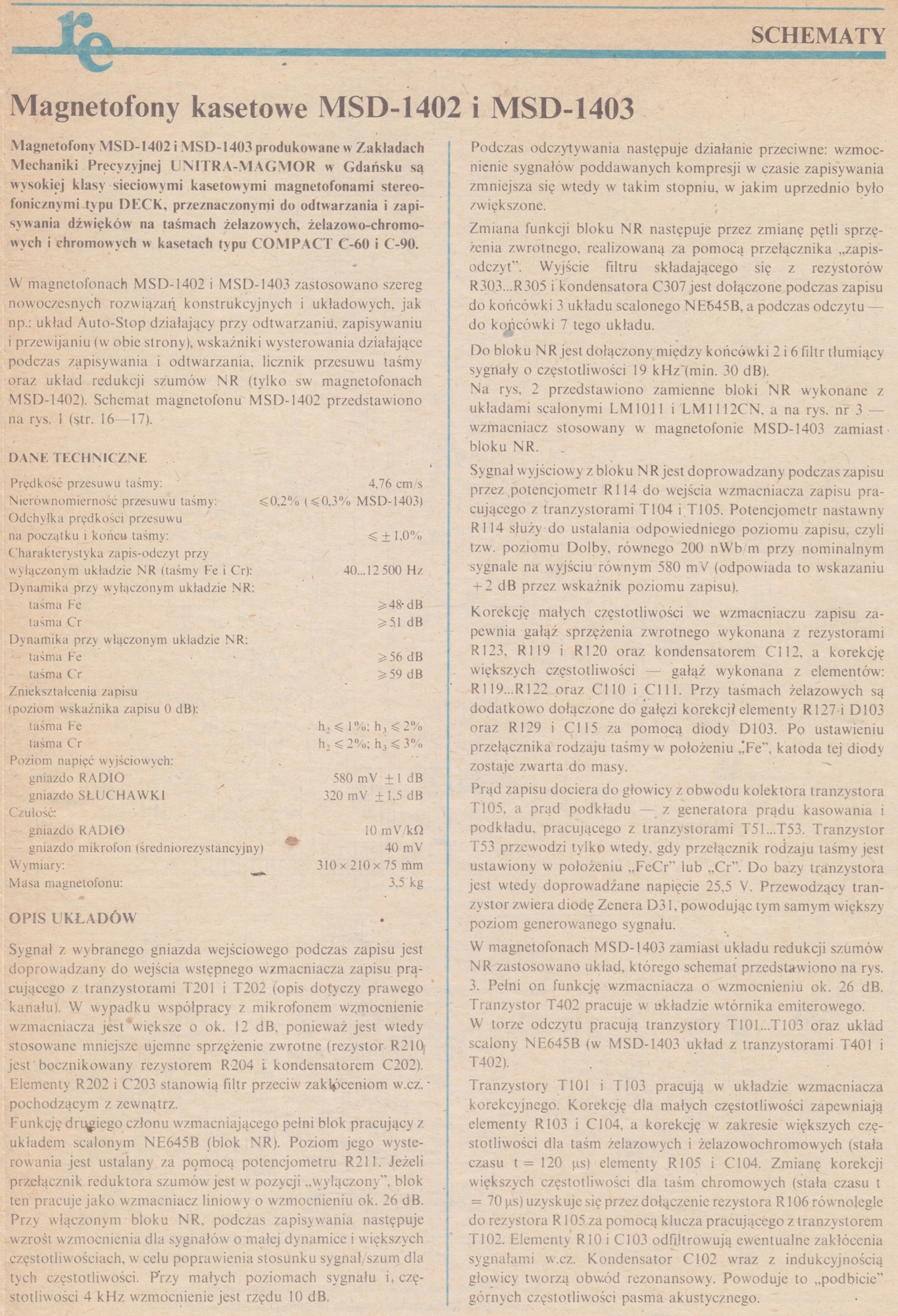 Miesięcznik Radio Elektronik nr - r. ( ): ”Magnetofony MSD-1402 i MSD-1403 produkowane w Zakładach Mechaniki Precyzyjnej UNITRA-MAGMOR w Gdańsku są wysokiej klasy sieciowymi kasetowymi magnetofonami stereofonicznymi typu DECK, przeznaczonymi do odtwarzania i zapisu dźwięków na taśmach żelazowych, żelazowo-chromowych i chromowych w kasetach typu COMPACT C-60 i C-90.”