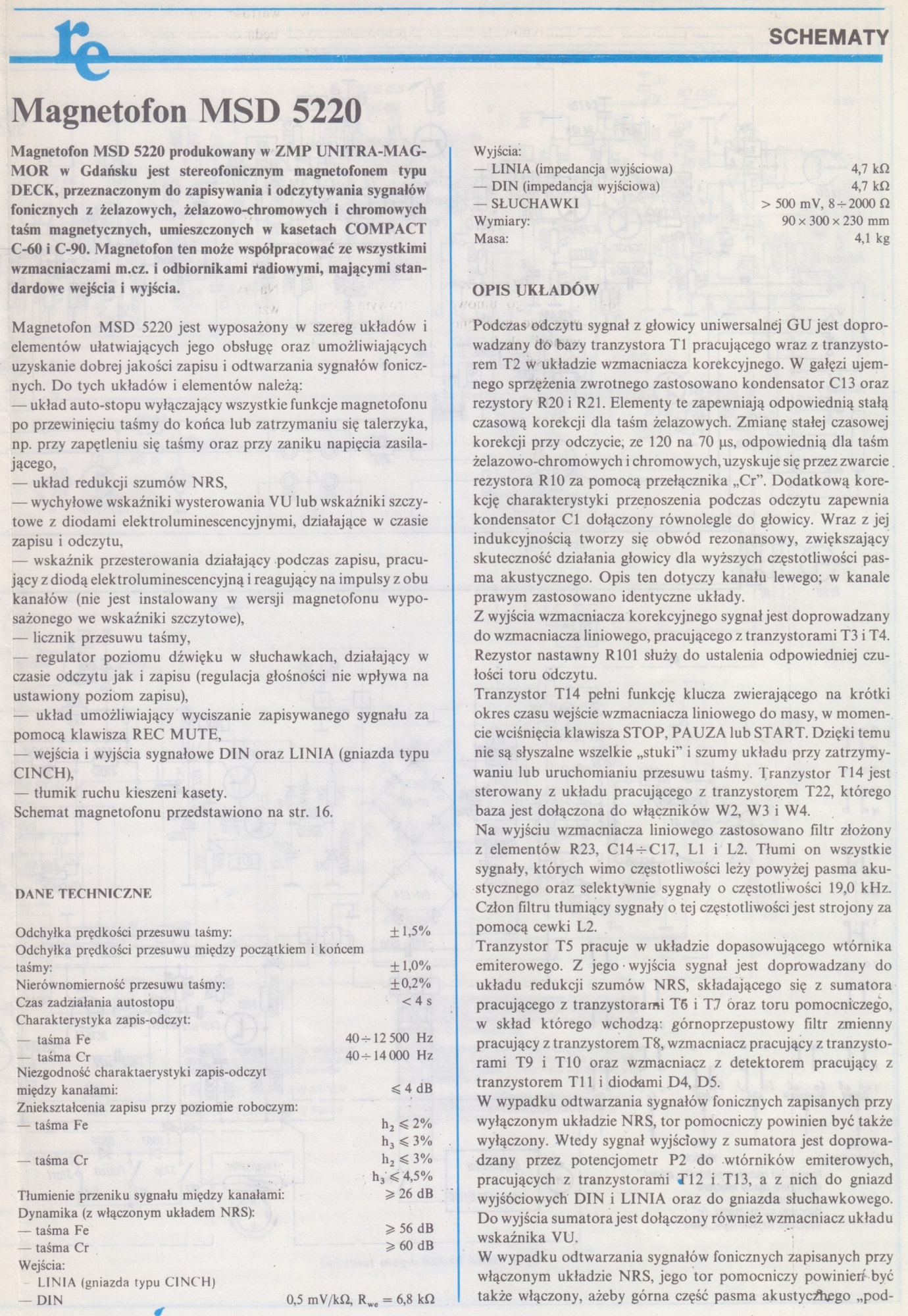 Miesięcznik Radio Elektronik nr - r. ( ): ”Magnetofon MSD 5220 produkowany w ZMP UNITRA-MAGMOR w Gdańsku jest stereofonicznym magnetofonem typu DECK, przeznaczonym do zapisywania i odtwarzania sygnałów fonicznych z żelazowych, żelazowo-chromowych i chromowych kaset magnetycznych, umieszczanych w kasetach COMPACT C-60 i C-90. Magnetofon ten może współpracować ze wszystkimi wzmacniaczami m.cz. i odbiornikami radiowymi, mającymi standardowe wejścia i wyjścia.”