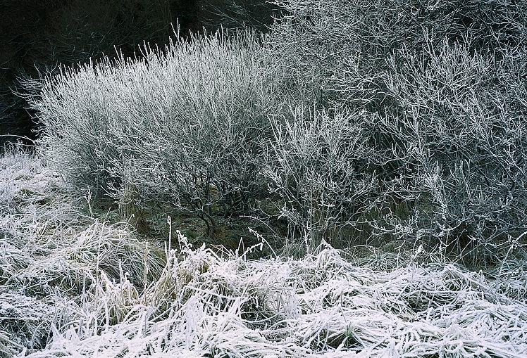 Zamarznięta mgła nadała przyrodzie lekkość i wyrafinowane piękno. To barwne zdjęcie wygląda jakby było zdjęciem czarno-białym. Wykonałem je po lewej stronie łąki w Dolinie Radości na początku lat 90. XX wieku.