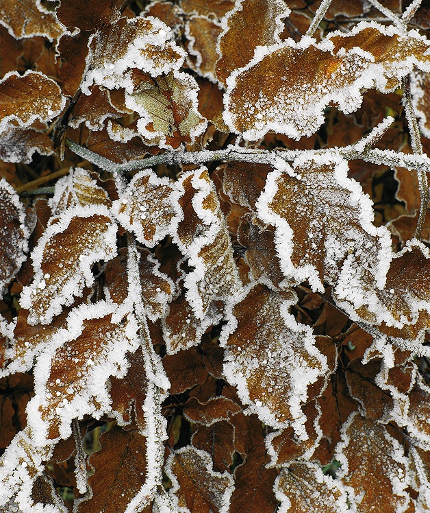 Gdy nastają pierwsze przymrozki i marznąca mgła zamienia się w kryształki lodu, warto pochylić się nad opadłymi z drzew liśćmi, by zobaczyć jak szron pięknie i fantazyjnie pokrywa ich obrzeża. Zdjęcie wykonałem w pobliżu dolnej części Czarciego Wzgórza w drugiej połowie lat 90. XX wieku.