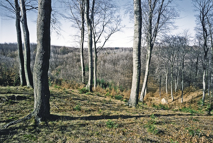 Śniegu już nie ma, lecz krajobraz jest zimny i surowy. Widok z grzbietu wzgórza w kierunku Białej Drogi, prowadzącej pod górę do łąki przy Owczarni.