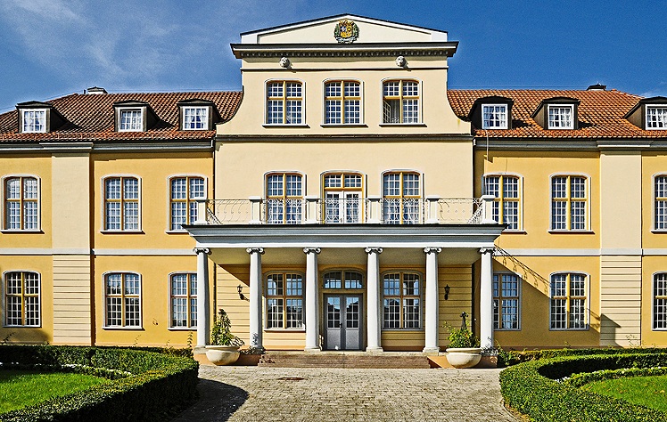 Sześć kolumn zwieńczonych jońskimi głowicami podtrzymuje duży balkon.