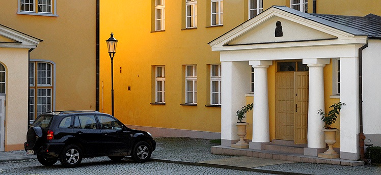 Fragment zabudowań od strony dziedzińca. Z lewej strony budynek pałacu, którego zdjęcia znajdują się na początku.