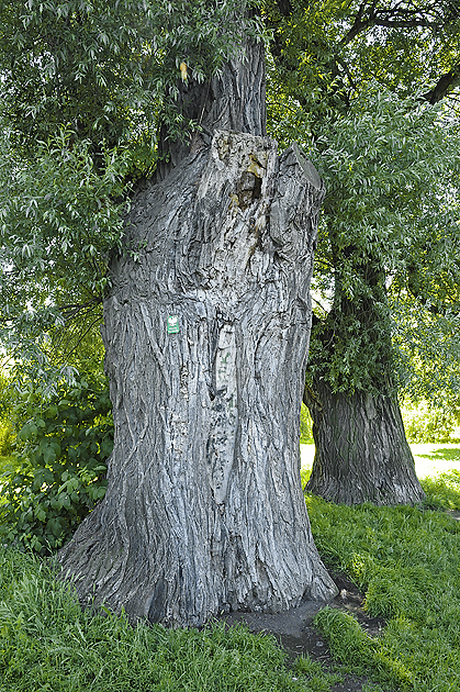 Imponujących rozmiarów pnie wierzb - pomników przyrody. Na pierwszym, któryś z "miłośników przyrody" nabazgrał coś zieloną farbą. Zdjęcie wykonałem 22 lipca 2012 roku.