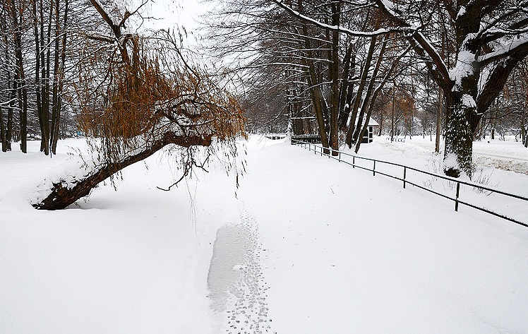 A to widok z tego samego mostku, tylko w drugą stronę. Potok Oliwski wpływa do stawu młyńskiego młyna I, który prawie w całości pokryty jest lodem i śniegiem.W głębi zdjęcia widoczny jest mostek, pod którym Potok Oliwski wypływa w dalszą wędrówkę ku ujściu do morza. Po prawej stronie ulica Pomorska. 26. 12. 2010 rok.