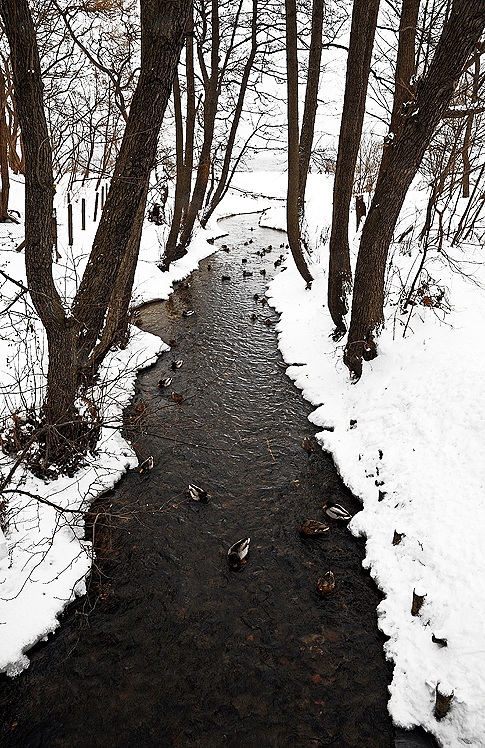 A to widok Potoku Oliwskiego z ostatniego mostku przed pokrytą śniegiem plażą. Za nią - morze. Zdjęcie z 14. 02. 2010 roku.
