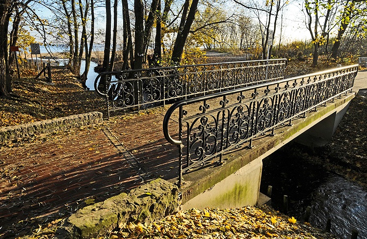 To jest ostatni mostek pod którym przepływa Potok Oliwski przed wpłynięciem do wód Bałtyku. Tym mostkiem przechodzą w sezonie letnim tysiące spacerowiczów, poza sezonem ruch jest dużo mniejszy, ale też znaczny. Z prawej strony zdjęcia widoczne jest wejście na plażę i tablica z napisem "67 Gdańsk", z lewej strony zdjęcia także jest widoczna analogiczna tablica, ale z napisem "68 Gdańsk", pokazująca kolejne wejście na plażę. Zdjęcie wykonałem wcześnie rano 19 listopada 2012 roku.