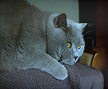 oparciu fotela, leżał rozłożony malowniczo liliowy kot brytyjski Eliasz,