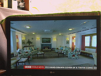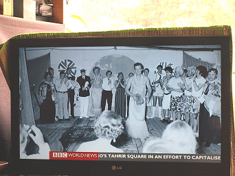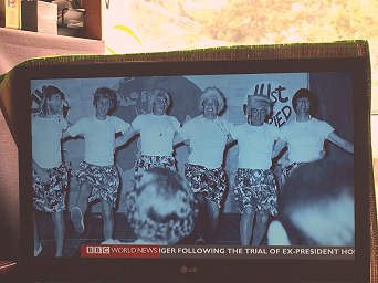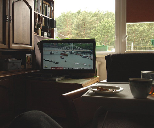 spoglądając na swoją ojczyznę na ekranie telewizora, i kombinując jak by tu