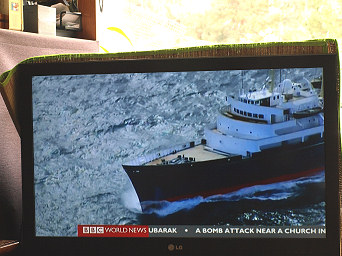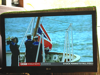 na transmisji parady jednostek pływających na Tamizie, przed Królową i jej