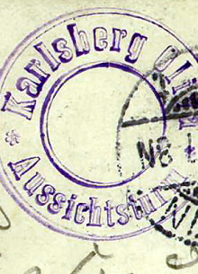![]() Pieczęć przybijana na wzgórzu lub w domku klucznika na rewersie pocztówki (źródło Dawny Gdańsk, pocztówki i zdjęcia, str.43 Sabaoth) |