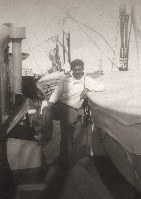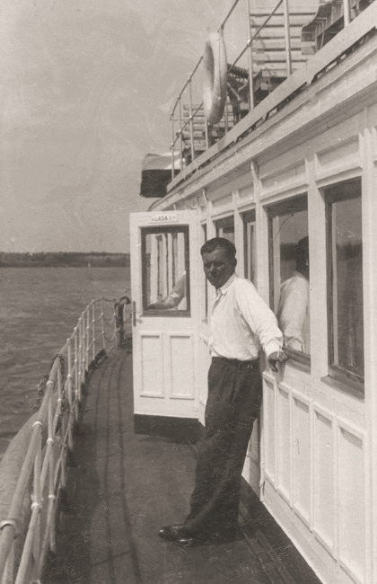 Archiwalne zdjęcia z albumu rodzinnego, Gdynia, po lewej zdjęcie na statku Białej Floty s/s Gdańsk, początek lat trzydziestych