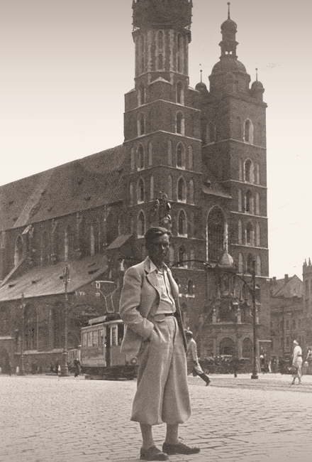 Archiwalne zdjęcia z albumu rodzinnego, w restauracji pensjonatu "Patria" w Krynicy, na prawym zdjęciu na tle kościoła Mariackiego w Krakowie, lata trzydzieste