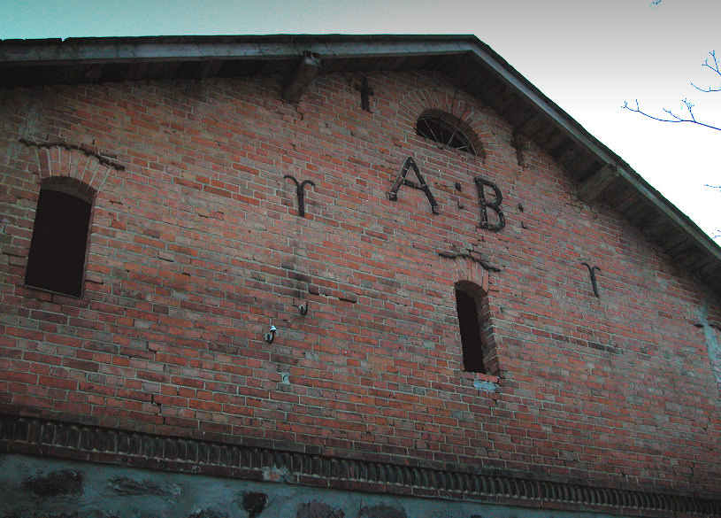 Małkowo, budynek gospodarczy, obora (zburzona), na szczycie inicjały A:B założyciela majątku Augusta Boelcke