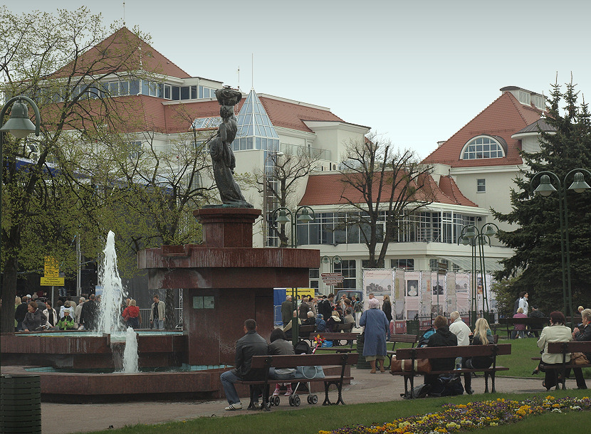 W Sopocie na Monciaku, widok na fontannê Jasia Rybaka i Dom Zdrojowy, widoczna wystawa