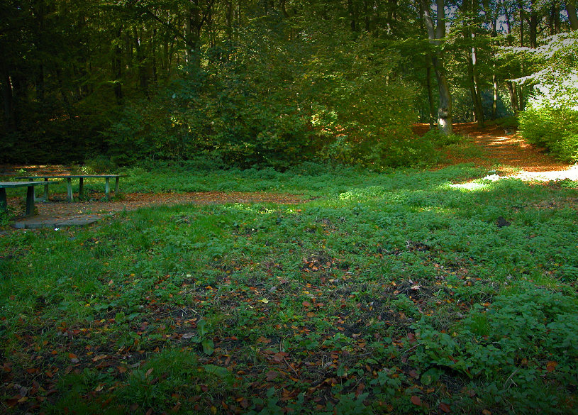 Po lewej za stołami studzienki. Domniemane ujęcie wody dla Oliwy.