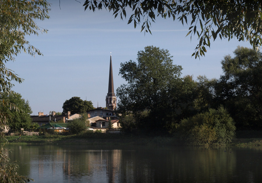 Oliwa, widok z okolicy Stawu Młyńskiego na kościół ewangielicki