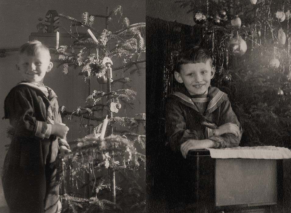 Archiwalne zdjęcia z albumu rodzinnego, Sopot, przy przystrojonych choinkach, ~~ 1945, 1947 r.