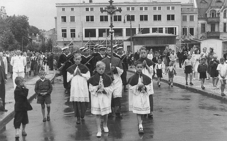Archiwalne zdjęcia z albumu rodzinnego, procesja na ul Rokossowskiego, 1947 r.