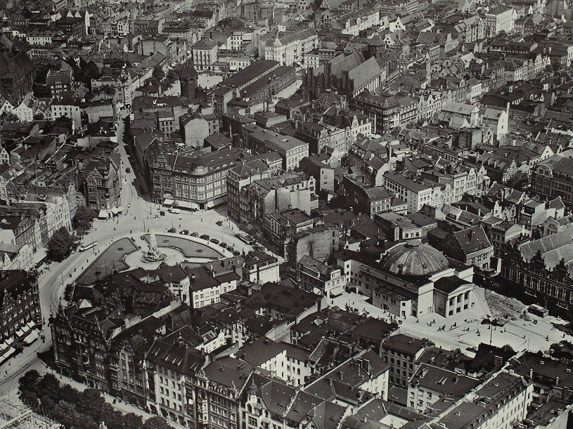 Widoki dawnego Gdańska, wystawa plenerowa*, Gdańsk na fotografii lotniczej z okresu międzywojennego, fragment, widok na okolice Targu Drzewnego i teatr