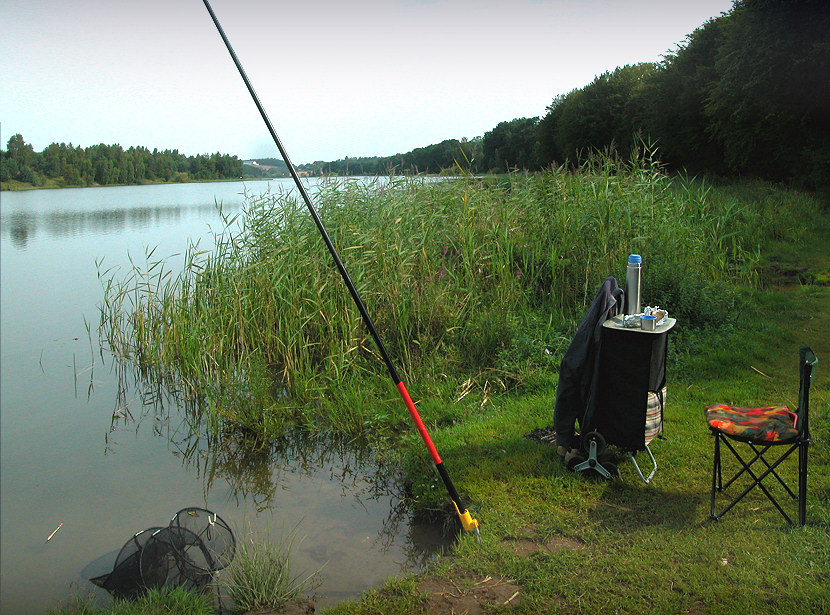 Akcesoria wędkarskie, sprzęt transportowy i inne gadżety na tle jeziora Wysockiego