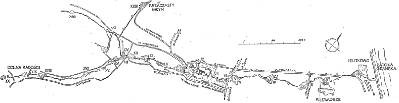 Fragment Doliny Radości. W lewym górnym rogu widoczny jest staw młyński młyna XVIII i budynek przy ul. Bytowskiej 5, wybudowany w latach 1905 - 1907 przez Otto Baumanna, w którym w latach 1945 - 1977 miało swoją siedzibę Nadleśnictwo Oliwa. Po przekątnej płynie niewidoczny na zdjęciu Potok Oliwski, zbliżając się do młyna XVII.