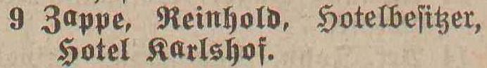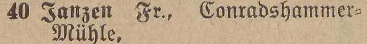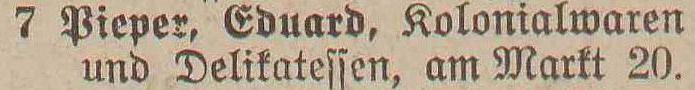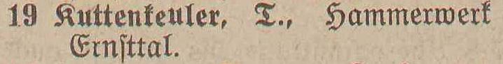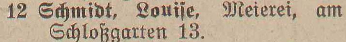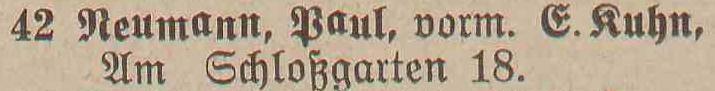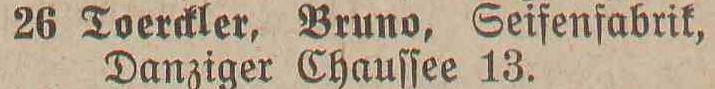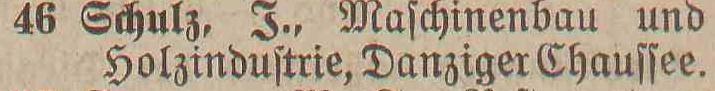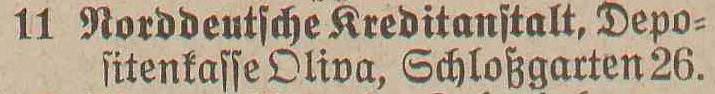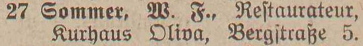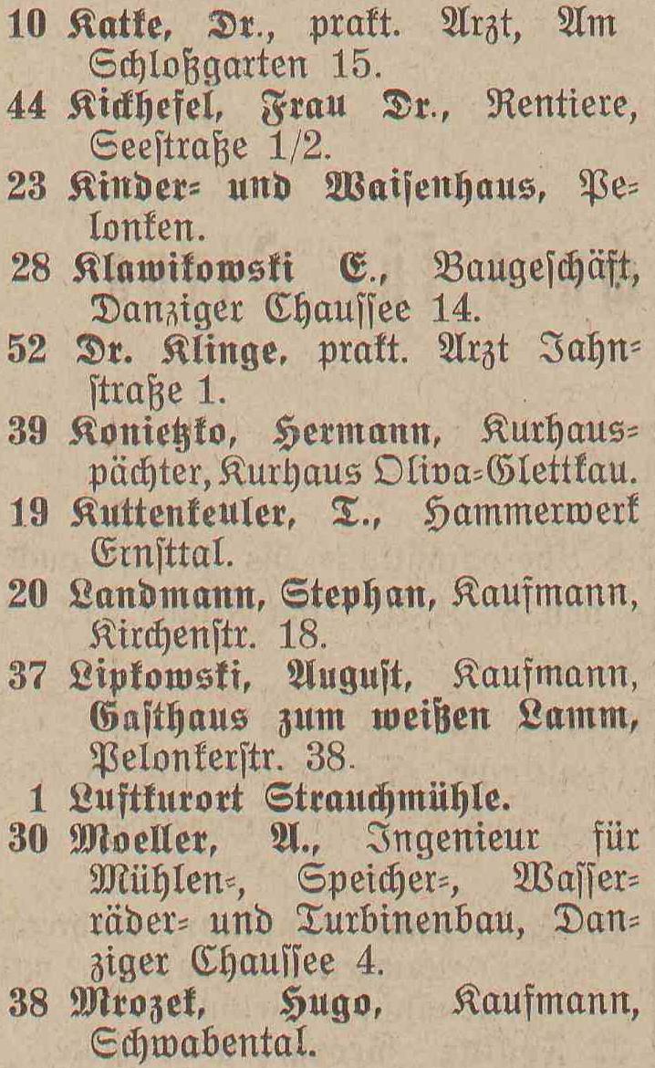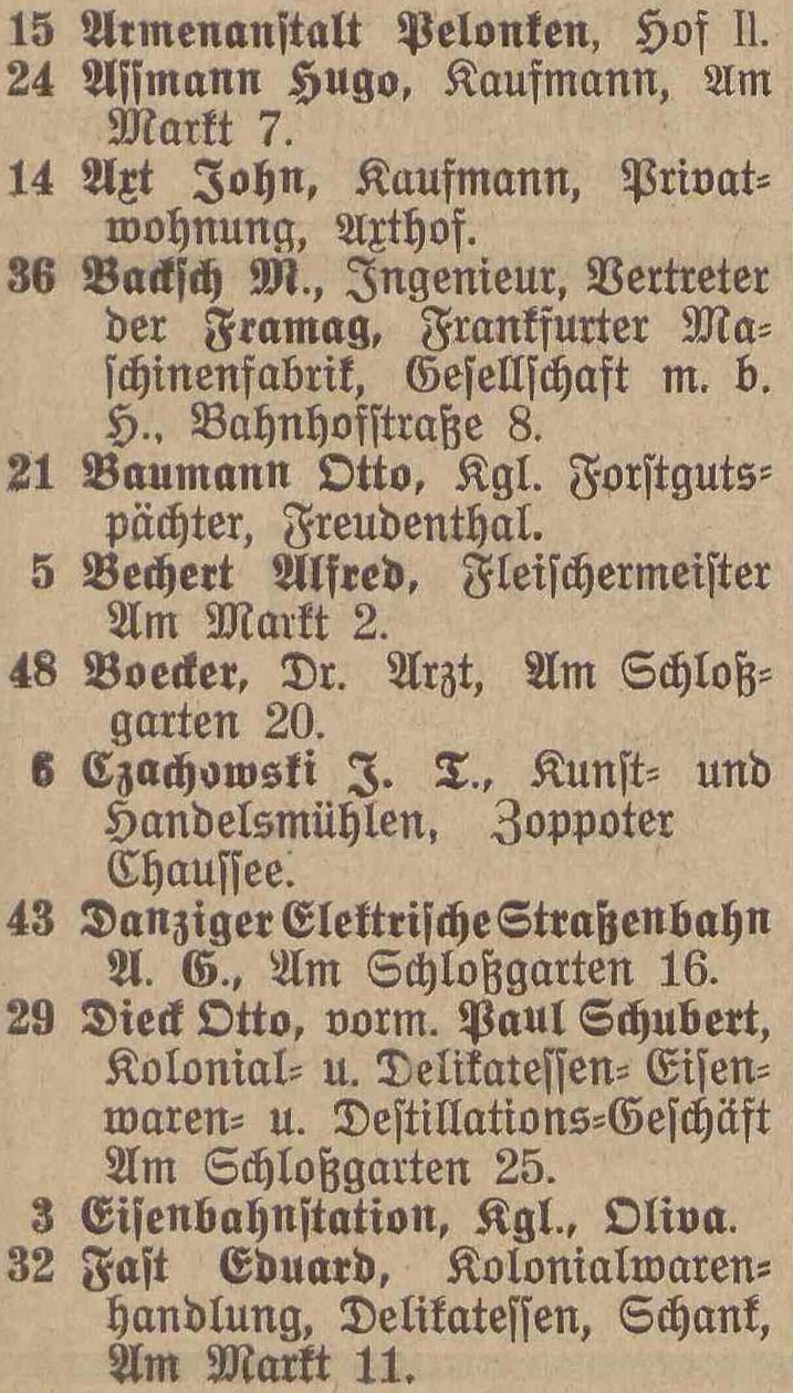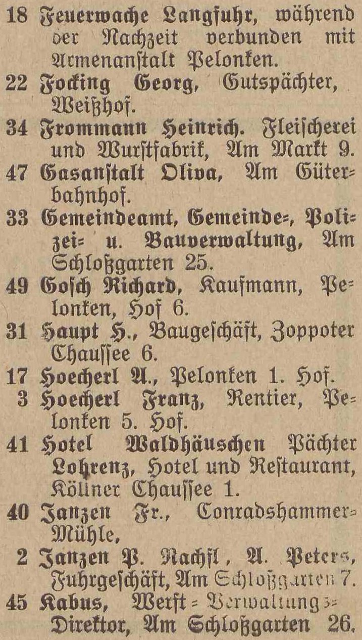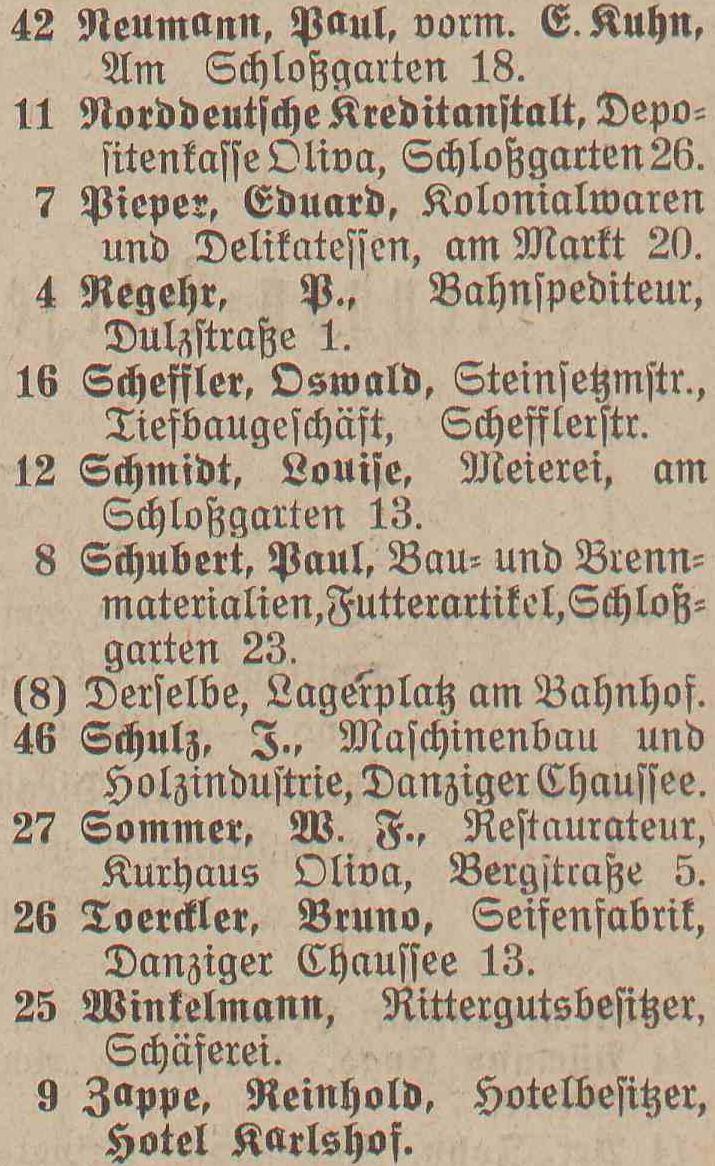 Spis telefonów gminy Oliwa › 50 numerów telefonicznych. Statystycznie, co 179 mieszkaniec posiada³ telefon. Adreßbuch der Gemeinde Oliva. 1909. Zbiory Pomorskiej Biblioteki Cyfrowej ![]() ![]() ![]() ![]() 01 ![]() Janzen P. Nachfl., A. Peters, Fuhrgeschäft, Am Schloßgarten 7. 02 ![]() Eisenbahnstation, Kgl., Oliva. 03 ![]() Regehr, P., Bahnspediteur, Dulzstraße 1. 04 ![]() Bechert Alfred, Fleischermeister, Am Markt 2. 05 ![]() Czachowski J. Z., Kunst- und Handelsmühlen, Zoppoter Chaussee. 06 ![]() Pieper, Eduard, Kolonialwaren und Delikatessen, Am Markt 20. 07 ![]() Schubert, Paul, Bau- und Brennmaterialien, Futterartikel, Schloßgarten 23. (8) Derselbe, Lagerplaß am Bahnhof. 08 ![]() Zappe, Reinhold, Hotelbesiker, Hotel Karlshof. 09 ![]() Katke, Dr., praft. Arzt, Am Schloßgarten 15. 10 ![]() Norddeutsche Kreditanstalt, Depositenkasse Olipa, Schloßgarten 26. 11 ![]() Schmidt, Louise, Meierei, Am Schloßgarten 13. 12 ![]() Hoecherl Franz, Rentier, Pelonken 5. Hof. 13 ![]() Axt John, Kaufmann, Privatwohnung, Axthof. 14 ![]() Armenanstalt Pelonken, Hof II. 15 ![]() Scheffler, Oswald, Steinseßmstr., Tiefbaugeschäft, Schefflerstr. 16 ![]() Hoecherl A., Pelonken 1. Hof. 17 ![]() Feuerwache Langfuhr, während der Nachzeit verbunden mit Armenanstalt Pelonken. 18 ![]() Kuttenfeuler, I., Hammerwerk Ernsttal. 19 ![]() Landmann, Stephan, Kaufmann, Kirchenstr. 18. 20 ![]() Baumann Otto, Kgl. Forstgutspächter, Freudenthal. 21 ![]() Focking Georg, Gutspächter, Weißhof. 22 ![]() Kinder- und Waisenhaus, Pelonken. 23 ![]() Asimann Hugo, Kaufmann, Am Markt 7. 24 ![]() Winkelmann, Rittergutsbesizer, Schäferei. 25 ![]() Toerdler, Bruno, Seifenfabrik, Danziger Chaussee 13. 26 ![]() Sommer, W. F., Restaurateur, Kurhaus Oliva, Bergstraße 5. 27 ![]() Klawikowski E., Baugeschäft, Danziger Chaussee 14. 28 ![]() Dieck Otto, porm. Paul Schubert, Kolonial- u. Delikatessen: Eisenwaren- u. Destillations-Geschäft, Am Schloßgarten 25. 29 ![]() Moeller, A., Ingenieur für Mühlens, Speichers, Wasserräder- und Turbinenbau, Danziger Chaussee 4. 30 ![]() Haupt H., Baugeschäft, Zoppoter Chaussee 6. 31 ![]() Fast Eduard, Kolonialwarenhandlung, Delikatessen, Schank, Am Marft 11. 32 ![]() Gemeindeamt, Gemeinde-, Polizei- u. Bauverwaltung, Am Schloßgarten 25. 33 ![]() Frommann Heinrich. Fleischerei und Wurstfabrik, Am Markt 9. 34 ![]() 35 BRAK. Backsch M., Ingenieur, Vertreter der Framag, Frankfurter Maschinenfabrik, Gesellschaft m. b. H., Bahnhofstraße 8. 36 ![]() Lipkowski, August, Kaufmann, Gasthaus zum weißen Lamm, Pelonkerstr. 38. 37 ![]() Mrozek, Hugo, Kaufmann, Schwabental. 38 ![]() Konietzko, Hermann, Kurhaus pächter, Kurhaus Oliva-Glettlau. 39 ![]() Janzen Fr., Conradshammer Mühle. 40 ![]() Hotel Waldhäuschen Pächter Lohrenz, Hotel und Restaurant, Köliner Chaussee 1. 41 ![]() Neumann, Paul, vorm. E. Kuhn, Am Schloßgarten 18. 42 ![]() Danziger Elektrische Straßenbahn A. G., Am Schloßgarten 16. 43 ![]() Kickefel, Frau Dr., Rentiere, Seestraße 1/2. 44 ![]() Kabus, Werft - Berwaltungs Direktor, Am Schloßgarten 26. 45 ![]() Schulz, I., Maschinenbau und Holzindustrie, Danziger Chaussee. 46 ![]() Gasanstalt Oliva, Am Güterbahnhof. 47 ![]() Boeder, Dr. Arzt, Am Schloßgarten 20. 48 ![]() Gosch Richard, Kaufmann, Pelonken, Hof 6. 49 ![]() 50 BRAK. 51 BRAK. Dr. Klinge, prakt. Arzt, JahnStraße 1. 52 ![]()