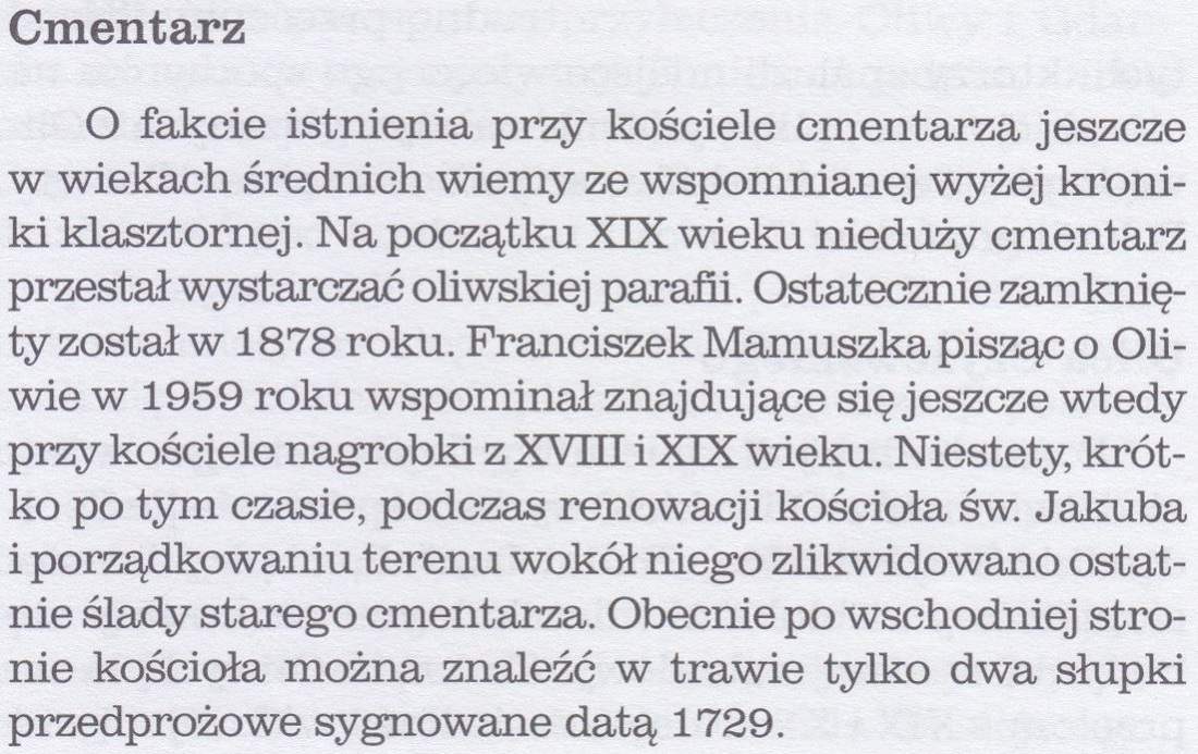 O fakcie istnienia przy kościele cmentarza jeszcze w wiekach średnich wiemy ze wspomnianej wyżej kroniki klasztornej. Na początku XIX wieku nieduży cmentarz przestał wystarczać oliwskiej parafii. Ostatecznie zamknięty został w 1878 roku. Franciszek Mamuszka pisząc o Oliwie w 1959 roku wspominał znajdujące się jeszcze wtedy przy kościele nagrobki z XVIII i XIX wieku. Niestety, krótko po tym czasie, podczas renowacji kościoła św. Jakuba i porządkowaniu terenu wokół niego zlikwidowano ostatnie ślady starego cmentarza. Obecnie po wschodniej stronie kościoła można znaleźć w trawie tylko dwa słupki przedprożowe sygnowane datą 1729.