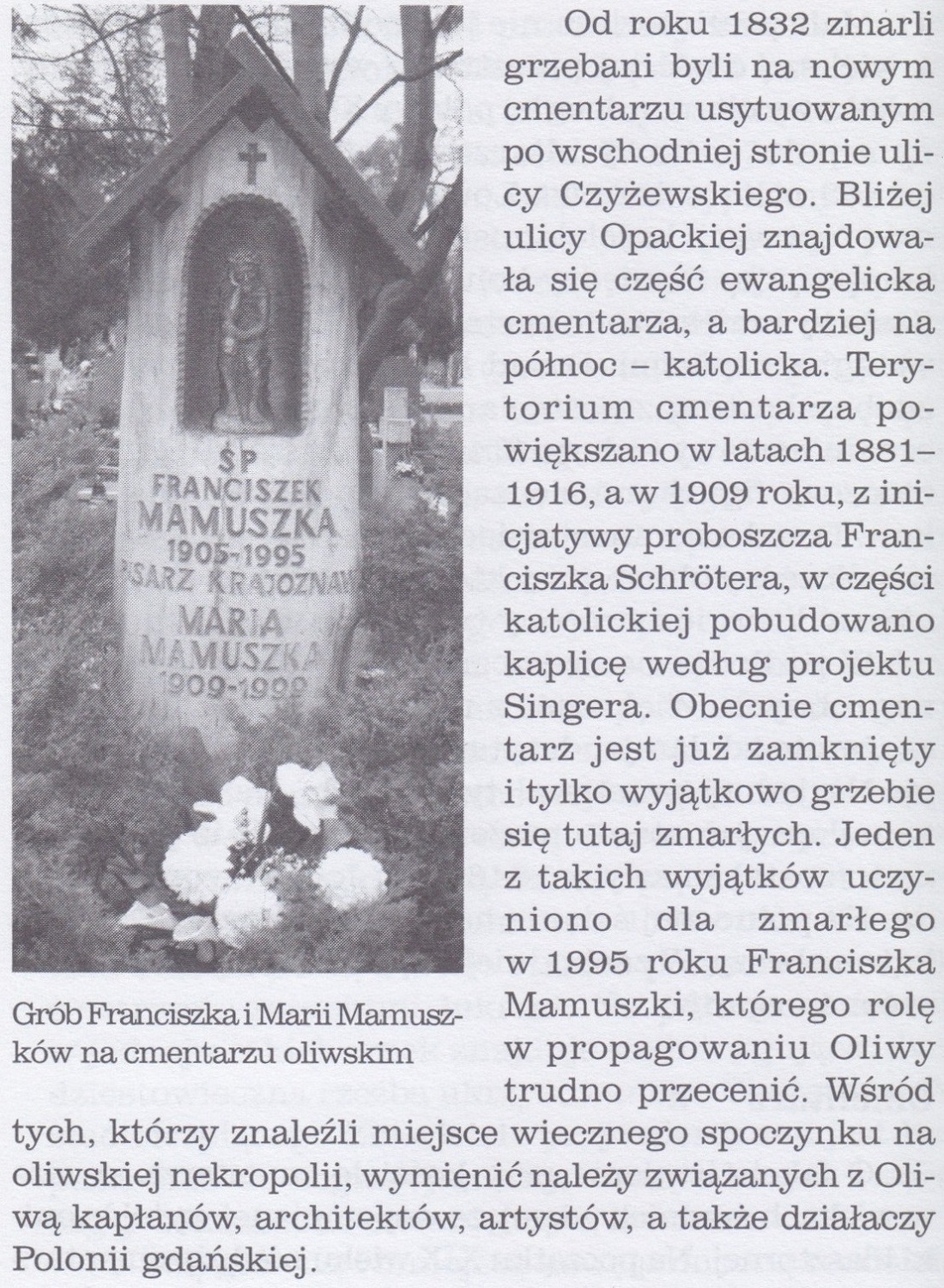 Od roku 1832 zmarli grzebani byli na nowym cmentarzu usytuowanym po wschodniej stronie ulicy Czyżewskiego. Bliżej ulicy Opackiej znajdowała się część ewangelicka cmentarza, a bardziej na północ - katolicka. Terytorium cmentarza powiększano w latach 1881- 1916, a w 1909 roku, z inicjatywy proboszcza Franciszka Schrötera, w części katolickiej pobudowano kaplicę według projektu Singera. Obecnie cmentarz jest już zamknięty i tylko wyjątkowo grzebie się tutaj zmarłych. Jeden z takich wyjątków uczyniono dla zmarłego w 1995 roku Franciszka Mamuszki, którego rolę w propagowaniu Oliwy trudno przecenić. Wśród tych, którzy znaleźli miejsce wiecznego spoczynku na oliwskiej nekropolii, wymienić należy związanych z Oliwą kapłanów, architektów, artystów, a także działaczy Polonii gdańskiej.