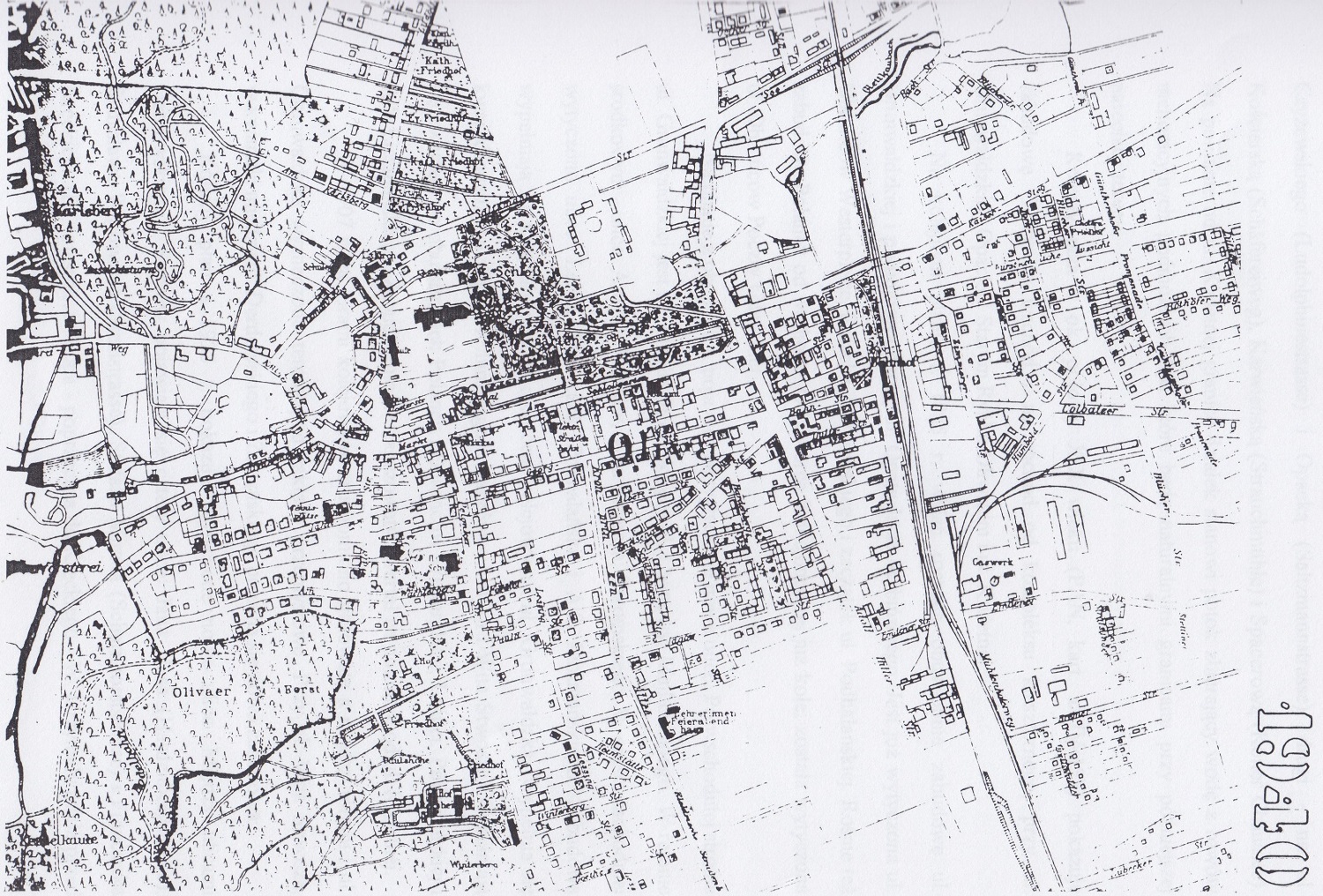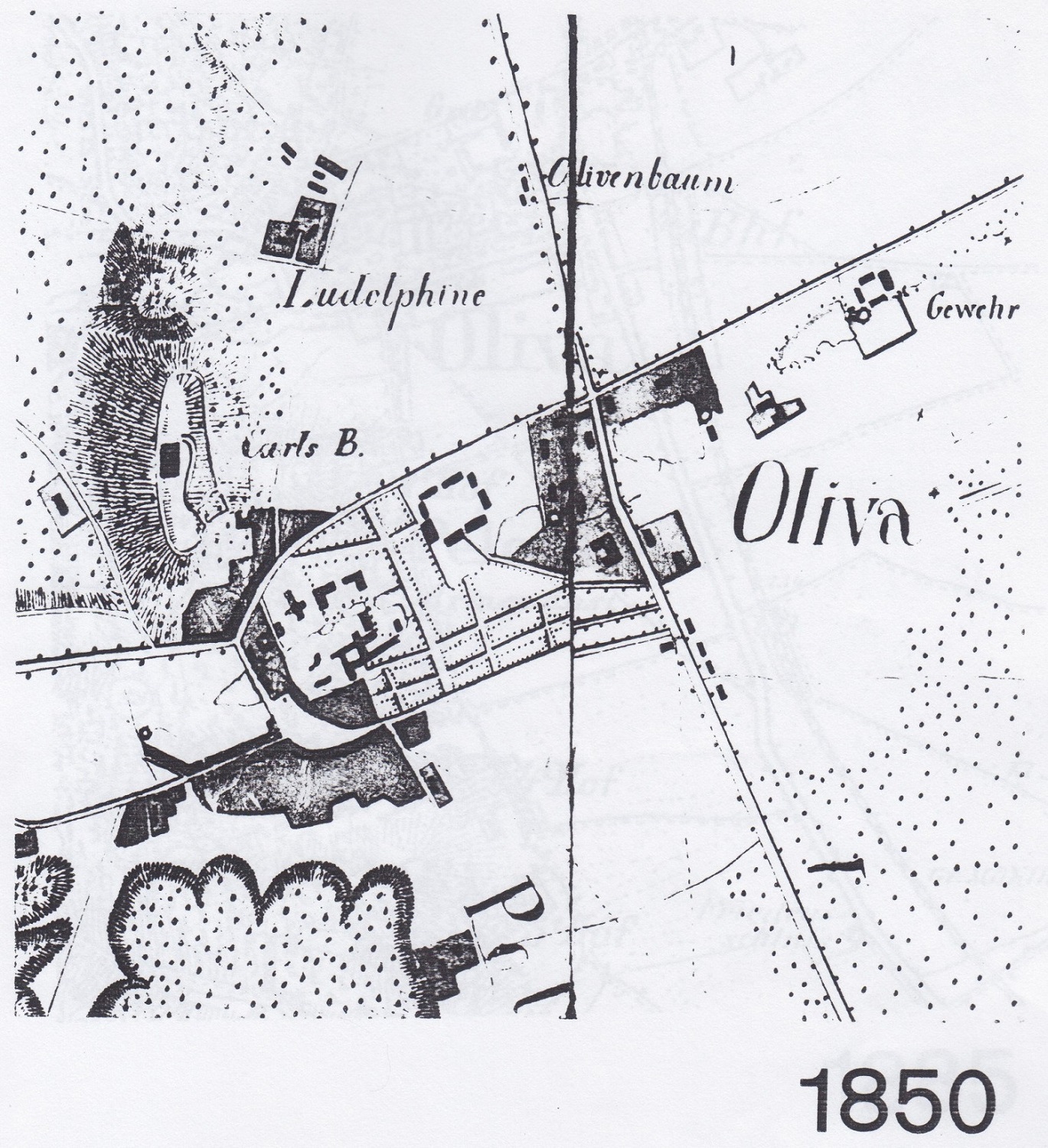 Kolejny plan z ok. połowy XIX wieku (PAN, kart. z IV-452) pokazuje zabudowę Oliwy na wschód i na zachód od kompleksu klasztornego, przy ul. Grunwaldzkiej, Opackiej Starym Rynku Oliwskim i ul. Kwietnej.