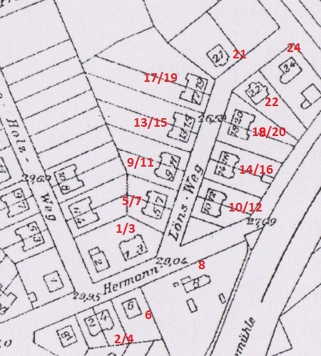 Kolorem czerwonym zaznaczono aktualną numerację. Fragment planu Oliwy z 1938 roku. Archiwum www. DawnaOliwa.pl.
