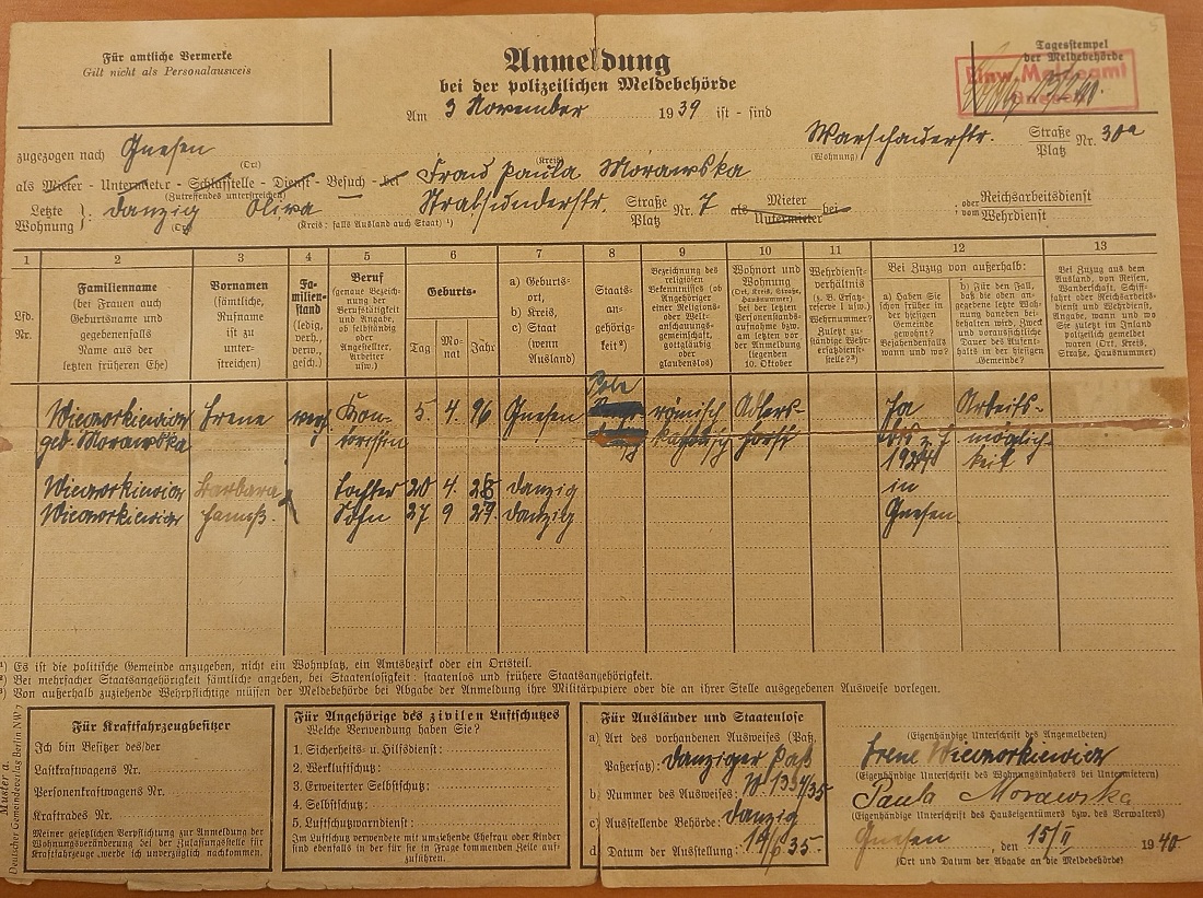 Karta meldunkowa z 3 listopada 1939. Oliva, Stralsunder Str. 7