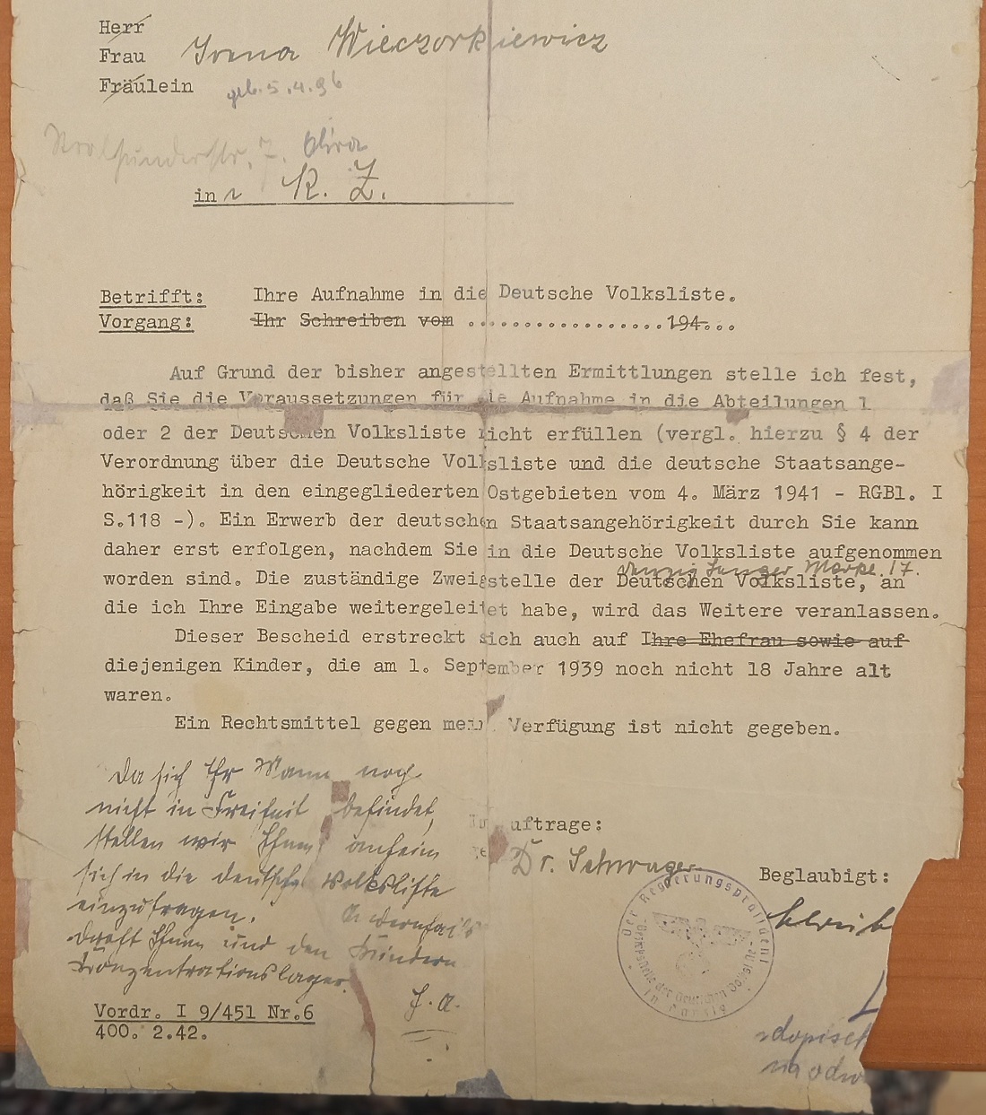 Irena Wieczorkiewicz. Dotyczy niemieckiej listy narodowościowej. Dokument z 04.1941-02.1942 roku.