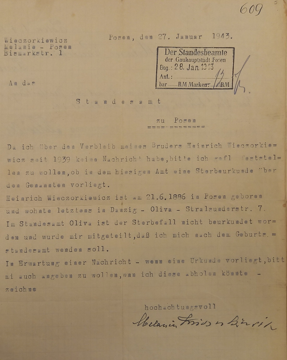 Ponieważ od 1939 r. nie mam żadnych informacji o miejscu pobytu mojego brata Heinricha Wieczorkiewicza, zwracam się do Pana z prośbą o sprawdzenie, czy w tutejszym urzędzie znajduje się akt zgonu wyżej wymienionego.