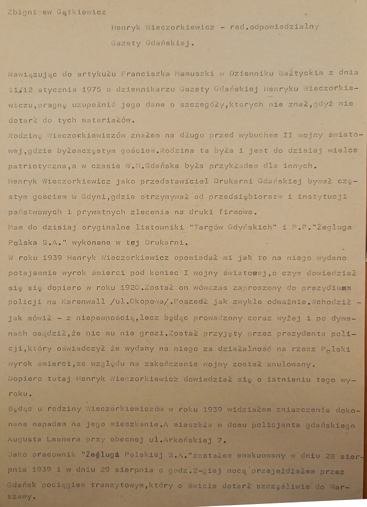 Nawiązując do artykułu Franciszka Mamuszki w Dzienniku Bałtyckim z dnia 11/12 stycznia 1975 o dziennikarzu Gazety Gdańskiej Henryku Wieczorkiewiczu, pragnę uzupełnić jego dane o szczególy, których nie znał, gdyż nie dotarł do tych materiałów.