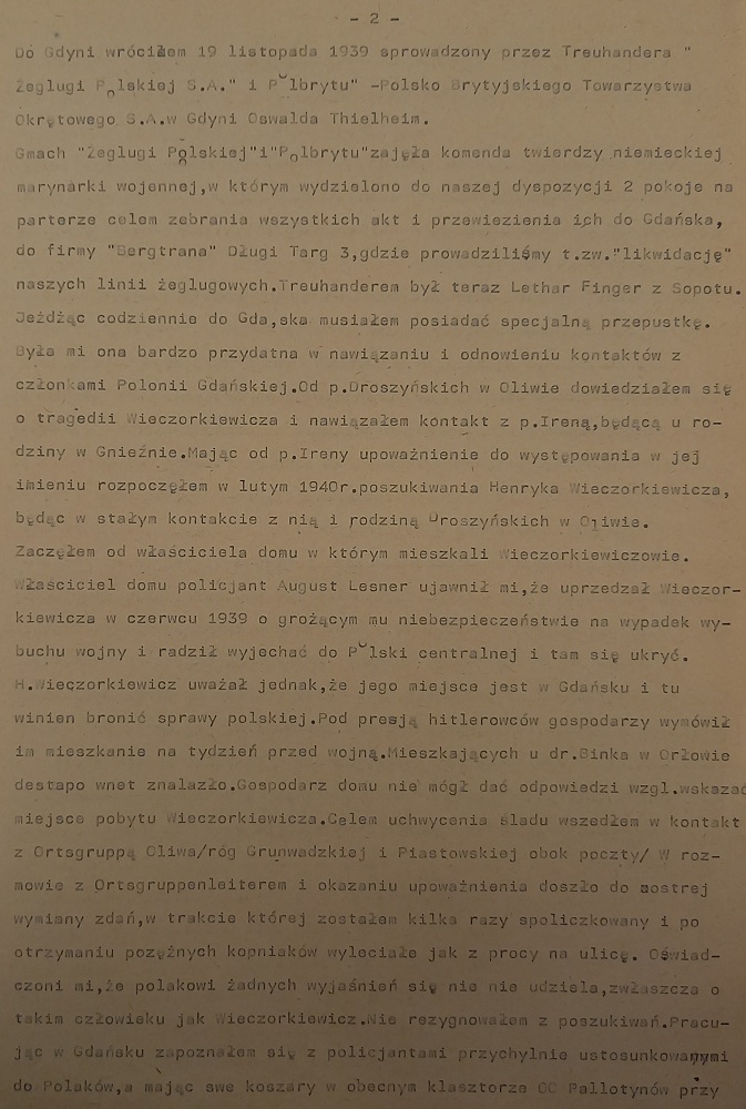 Gmach "Żeglugi Polskiej" i "Polbrytu" zajęła komenda twierdzy niemieckiej marynarki wojennej, w którym wydzielono do naszej dyspozycji 2 pokoje na parterze celem zebrania wszystkich akt i przewiezienia ich do Gdańska, do firmy "Bergtrana" Długi Targ 3, gdzie prowadziliśmy t.zw. "likwidację" naszych linii żeglugowych. Treuhanderem był teraz Lethar Finger z Sopotu. Jeżdżąc codziennie do Gdańska musiałem posiadać specjalną przepustkę. Była mi ona bardzo przydatna w nawiązaniu i odnowieniu kontaktów z członkami Polonii Gdańskiej. Od p. Droszyńskich w Oliwie dowiedziałem się o tragedii Wieczorkiewicza i nawiązałem kontakt z p, Ireną, będącą u rodziny w Gnieźnie. Mając od p. Ireny upoważnienie do występowania w jej imieniu rozpocząłem w lutym 1940 r. poszukiwania Henryka Wieczorkiewicza, będąc w stałym kontakcie z nią i rodziną Droszyńskich w Oliwie.