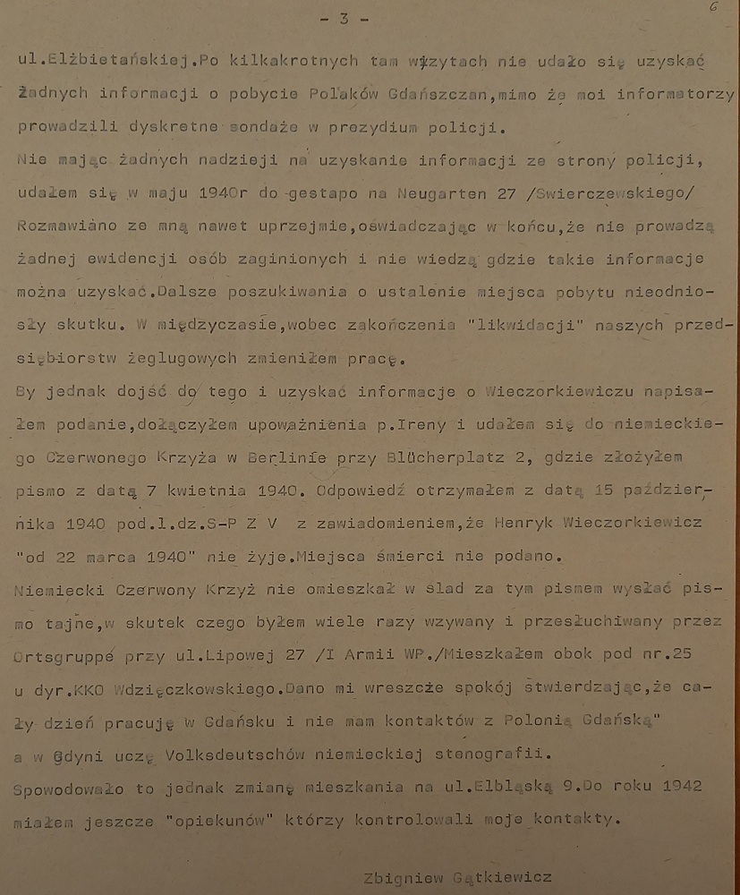 Zacząłem od właściciela domu w którym mieszkali Wieczorkiewiczowie. Właściciel domu policjant August Lesner ujawnił mi, że uprzedzał Wieczorkiewicza w czerwcu 1939 o grożącym mu niebezpieczeństwie na wypadek wybuchu wojny i radził wyjechać do Polski centralnej i tam się ukryć. H. Wieczorkiewicz uważał jednak, że jego miejsce jest w Gdańsku i tu winien bronić sprawy polskiej. Pod presja hitlerowców gospodarzy wymówił im mieszkanie na tydzień przed wojną. Mieszkających u dr. Binka w Orłowie gestapo wnet znalazło. Gospodarz domu nie mógł dać odpowiedzi wzgl. wskazać miejsce pobytu Wieczorkiewicza. Celem uchwycenia śladu wszedłem w kontakt z. Ortsgruppą Oliwa /róg Grunwaldzkiej i Piastowskiej obok poczty/. W rozmowie z Ortsgruppenleiterem i okazaniu upoważnienia doszło do ostrej wymiany zdań, w trakcie której zostałem kilka razy spoliczkowany i po otrzymaniu potężnych kopniaków wyleciałem jak z procy na ulice. Oświadczono mi, że polakowi żadnych wyjaśnień się nie udziela, zwłaszcza o takim człowieku jak Wieczorkiewicz. Nie rezygnowałem z poszukiwań. Pracując w Gdańsku zapoznałem się z policjantami przychylnie ustosunkowanymi do Polaków, a mając swe koszary w obecnym klasztorze OO Pallotynów przy ul. Elżbietańskiej. Po kilkakrotnych tam wizytach nie udało się uzyskać żadnych informacji o pobycie Polaków Gdańszczan, mimo że moi informatorzy prowadzili dyskretne sondaże w prezydium policji.