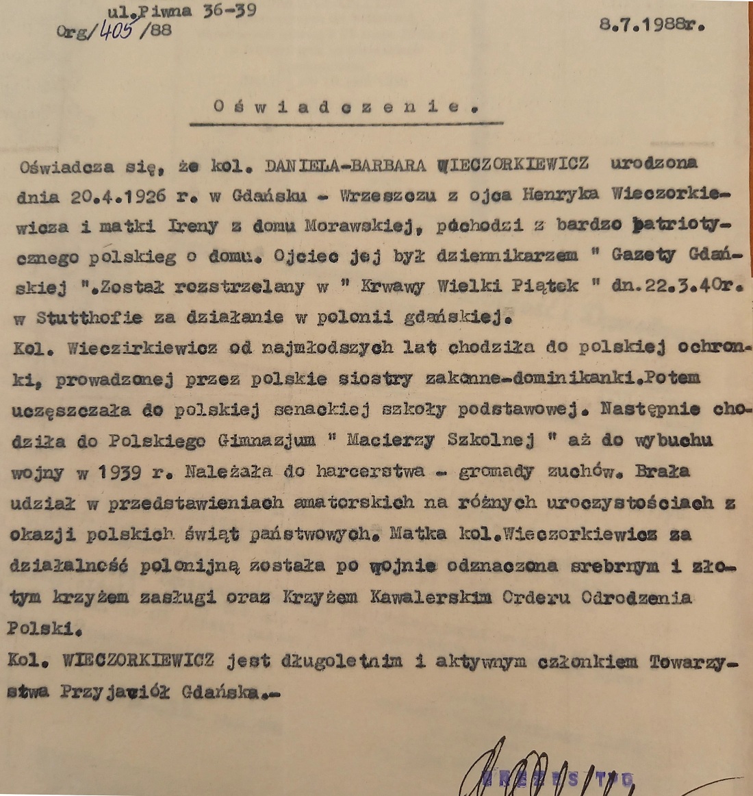 Oświadcza się, że kol. DANIELA-BARBARA WIECZORKIEWICZ urodzona dnia 20.4.1926 r. w Gdańsku - Wrzeszczu z ojca Henryka Wieczorkiewicza i matki Ireny z domu Morawskiej, pochodzi z bardzo patriotycznego polskiego domu. Ojciec jej był dziennikarzem "Gazety Gdańskiej". Został rozstrzelany w "Krwawy Wielki Piątek" dn. 22.3.40 r. w Stutthofie za działanie w polonii gdańskiej.