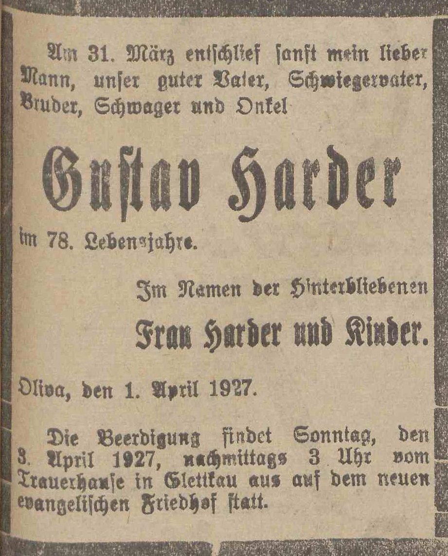 Gustav Harder. Olivaer Zeintung nr 78 z 02. 04. 1927 r.