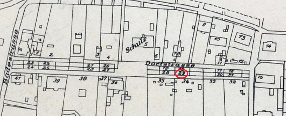 Glettkau (1909) -› Glettkau 22 (1910-1914) -› Glettkau Dorfstraße 15 (1915-1921) -› Dorfstraße 15 (1925-1928) -› Dorfstraße 15a (1929) -› Dorfstraße 29 (1931-1942).