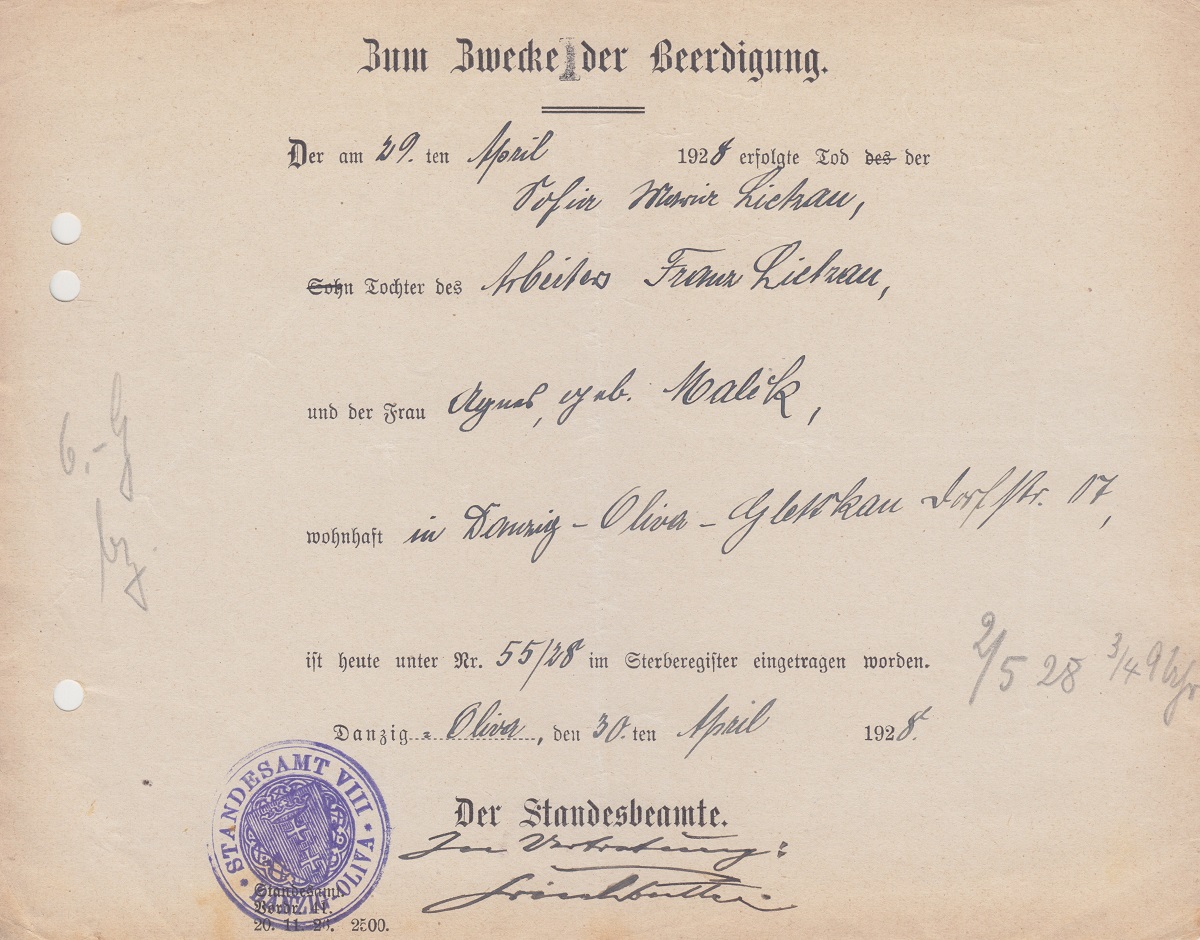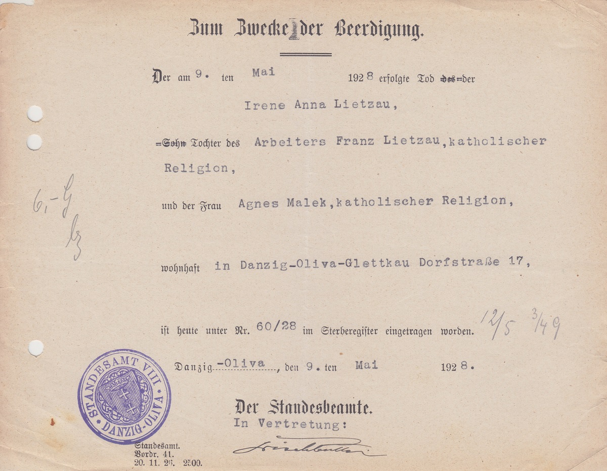 Irene Anna Lietzau. Franz Lietzau. Agnes Malek. Zum Zwecke der Beerdigung wydane 9. 5. 1928 (zaświadczenie dla celów pochówku). Zbiory Piotra Leżyńskiego.